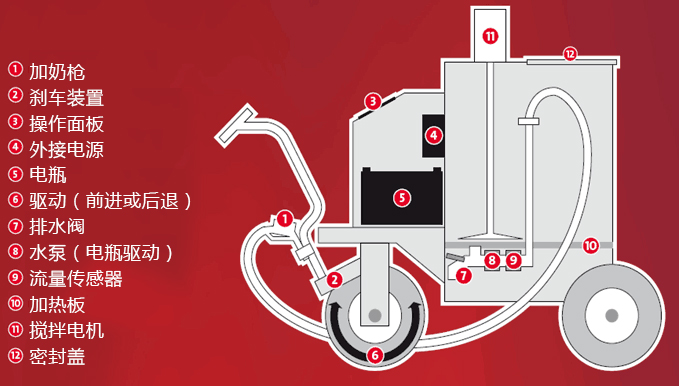 9、機(jī)器配置直流電池,為微機(jī)、顯示器、攪拌電機(jī)、加奶電機(jī)提供電源;