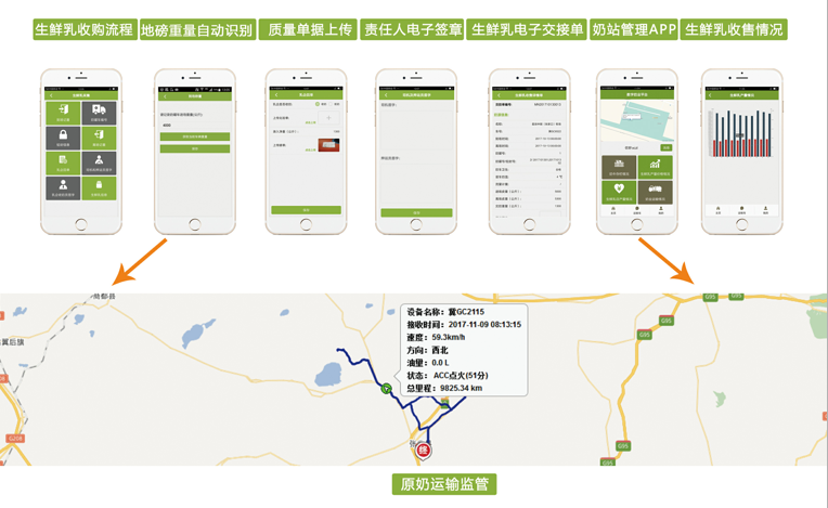 生鮮乳收購(gòu)運(yùn)輸系統(tǒng)通過(guò)打通牧場(chǎng)/奶站-乳企從生鮮乳生產(chǎn)到運(yùn)輸、銷(xiāo)售整體環(huán)節(jié),流程中各環(huán)節(jié)的數(shù)據(jù)自動(dòng)采集,實(shí)現(xiàn)原奶運(yùn)輸?shù)娜鞒瘫O(jiān)控,確保了奶源質(zhì)量的安全和責(zé)任追溯。同時(shí),通過(guò)手機(jī)APP及二維碼技術(shù)的應(yīng)用,對(duì)生鮮乳交易過(guò)程產(chǎn)生的數(shù)據(jù)自動(dòng)采集和電子單據(jù)匯總,實(shí)現(xiàn)了原奶交接單的電子化,明確了各關(guān)鍵節(jié)點(diǎn)的責(zé)任主體,避免了傳統(tǒng)人工錄入單據(jù)過(guò)程中產(chǎn)生的誤差和單據(jù)整理成本。