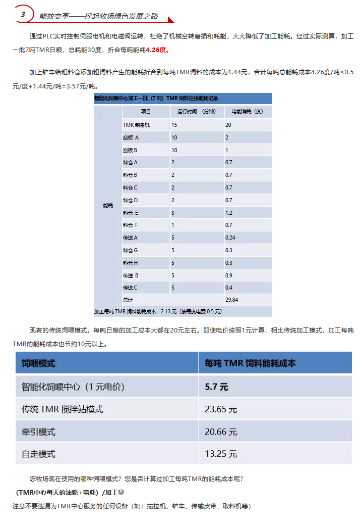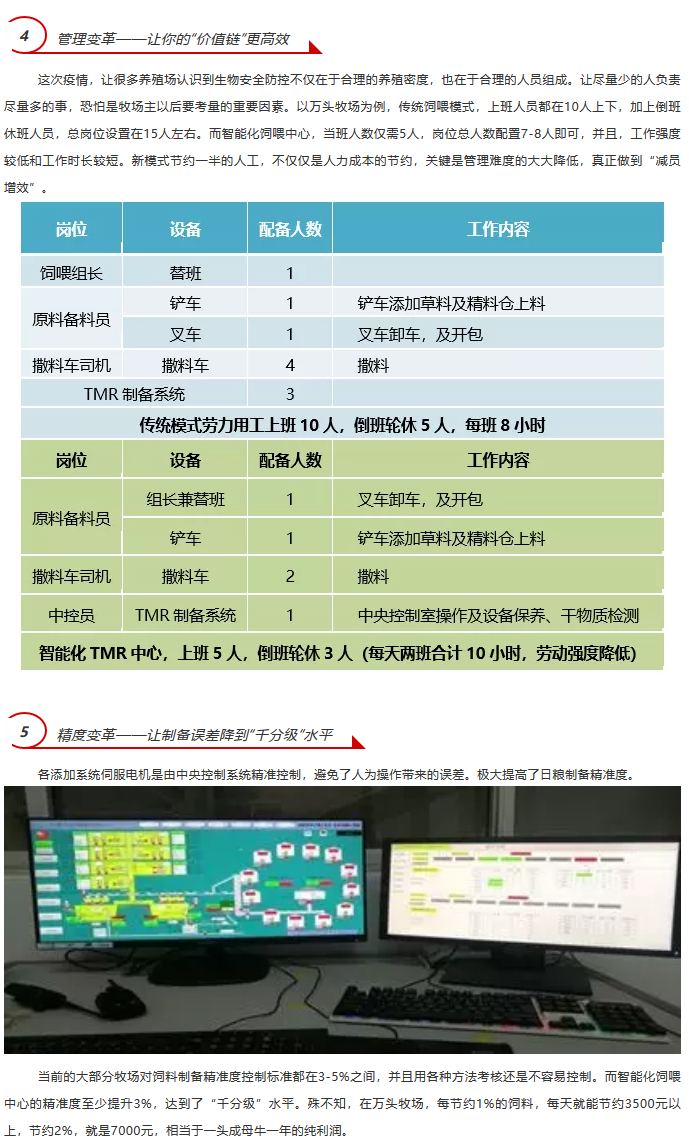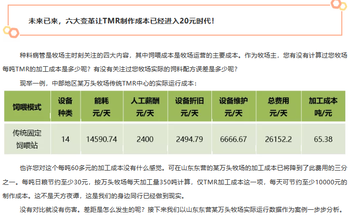 對(duì)于一個(gè)萬(wàn)頭牧場(chǎng)來(lái)說(shuō),采用傳統(tǒng)方式的固定式攪拌站大約需要300-500萬(wàn)元,而高效智能飼喂中心系統(tǒng)的投資在1000萬(wàn)元左右,但是高效智能飼喂中心系統(tǒng)加工每噸TMR的能耗成本不足10元,完全運(yùn)營(yíng)成本也就30元以內(nèi)。通過(guò)精準(zhǔn)控制,避免飼料浪費(fèi),每年節(jié)省的成本和創(chuàng)造的效益在500萬(wàn)元以上,最多2年就可以收回增加的投資。