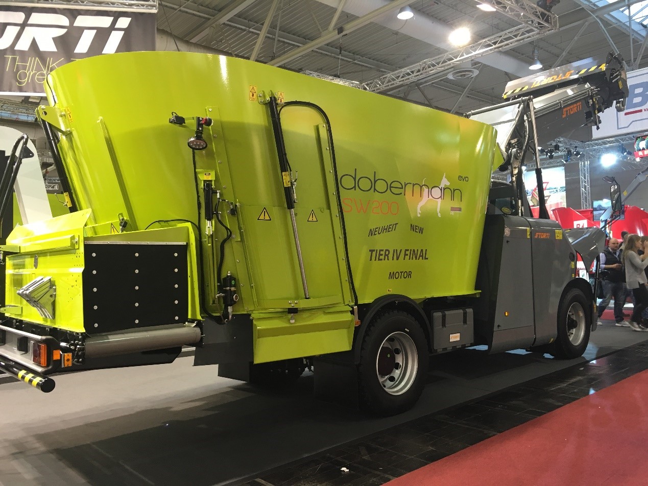 圖4司達(dá)特展出第二款產(chǎn)品:最新歐Ⅳ排放標(biāo)準(zhǔn)立式自走式TMR飼料制備機(jī)Dobermann SW200 GP EVO