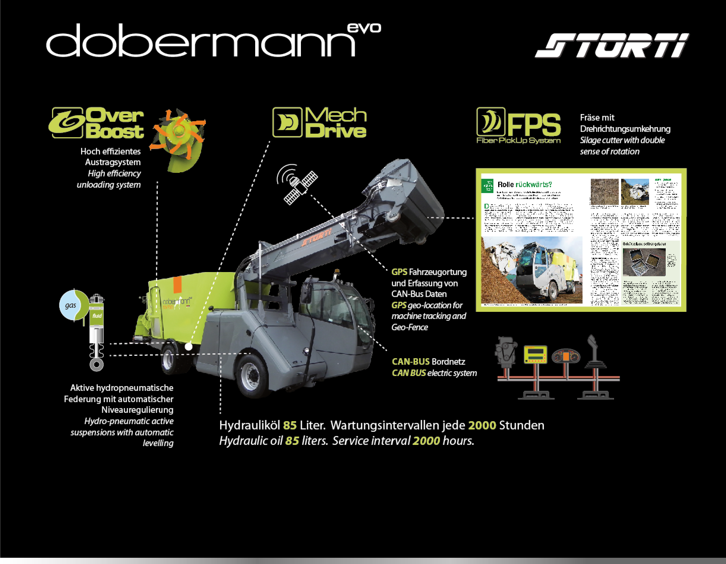 司達(dá)特展示了最新自走式Dobermann SW300 GP EVO高速機(jī)型和歐Ⅳ排放標(biāo)準(zhǔn)立式自走式TMR飼料制備機(jī)Dobermann SW200 GP EVO節(jié)能減排機(jī)型,最高時(shí)速可達(dá)到40km/h,且此兩種機(jī)型融合了Can-Bus 控制器局域網(wǎng)總線技術(shù)和節(jié)能減排系統(tǒng),具備了以下主要優(yōu)勢(shì):