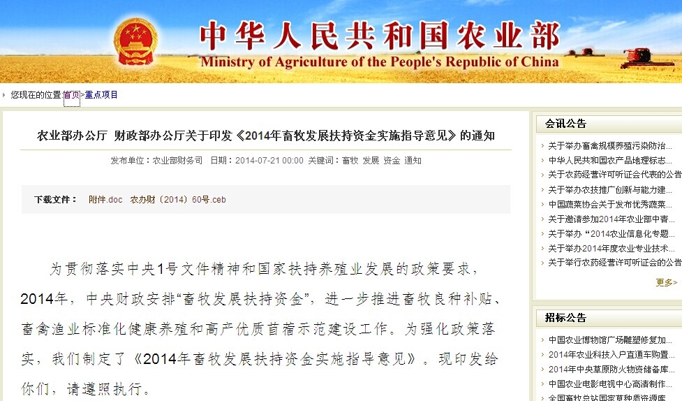 2014年7月21日,農(nóng)業(yè)部辦公廳、財政部辦公廳連發(fā)三文: