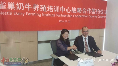 2014年5月22日,北京國科誠泰農(nóng)牧設(shè)備有限公司總裁李蔚女士與雀巢集團(tuán)大中華區(qū)集團(tuán)農(nóng)業(yè)服務(wù)總監(jiān)鄂華德(Robert m . erhard)先生簽訂了“雀巢奶牛養(yǎng)殖培訓(xùn)中心戰(zhàn)略合作”協(xié)議。