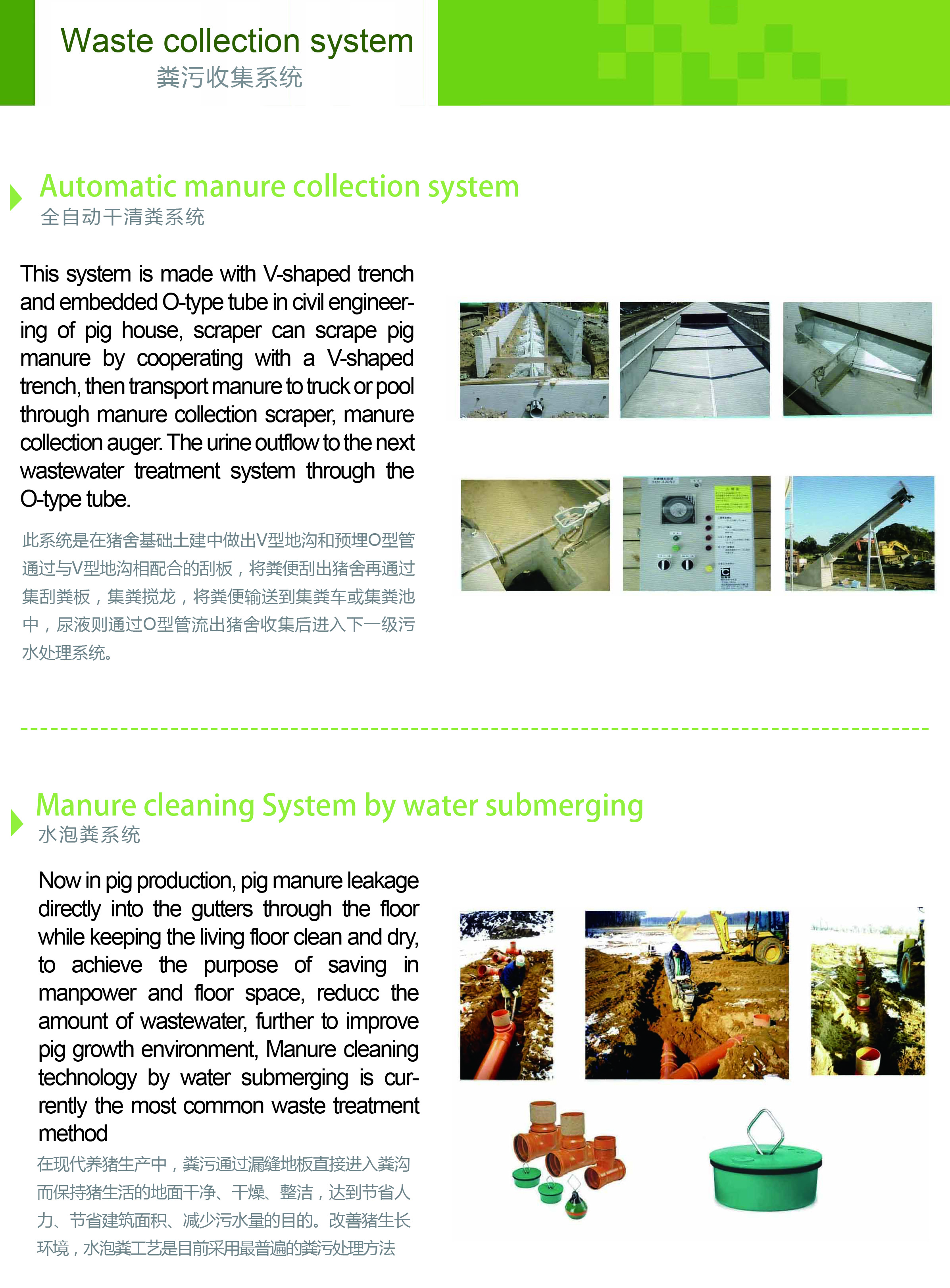此系統(tǒng)是在豬舍基礎(chǔ)土建中做出V型地溝和預(yù)埋O型管通過與V型地溝相配合的刮板,將糞便刮出豬舍再通過集刮糞板,集糞攪龍,將糞便輸送到集糞車或集糞池中,尿液則通過O型管流出豬舍收集后進(jìn)入下一級污水處理系統(tǒng)。