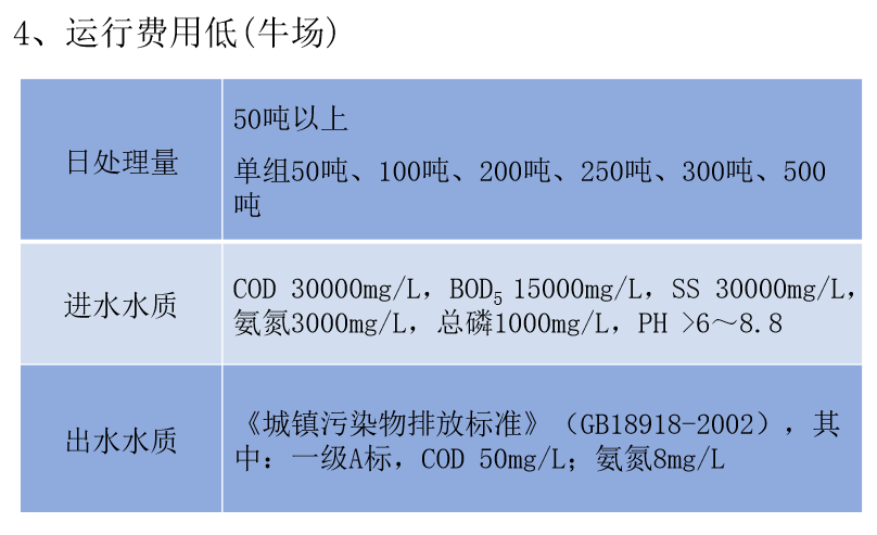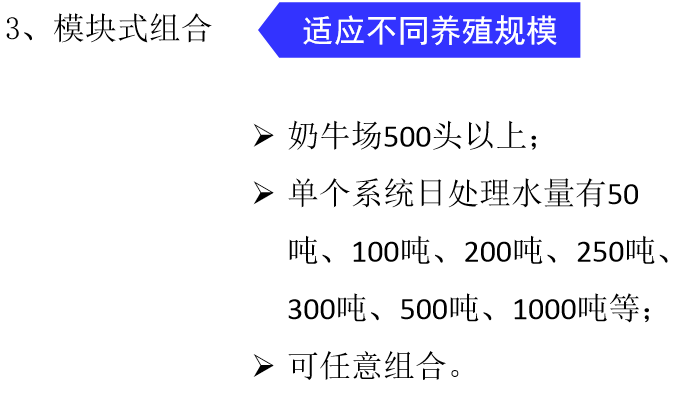 奶牛場(chǎng)500頭以上,單個(gè)系統(tǒng)日處理水量50噸、100噸、200噸、250噸、300噸、500噸、1000噸可任意組合。